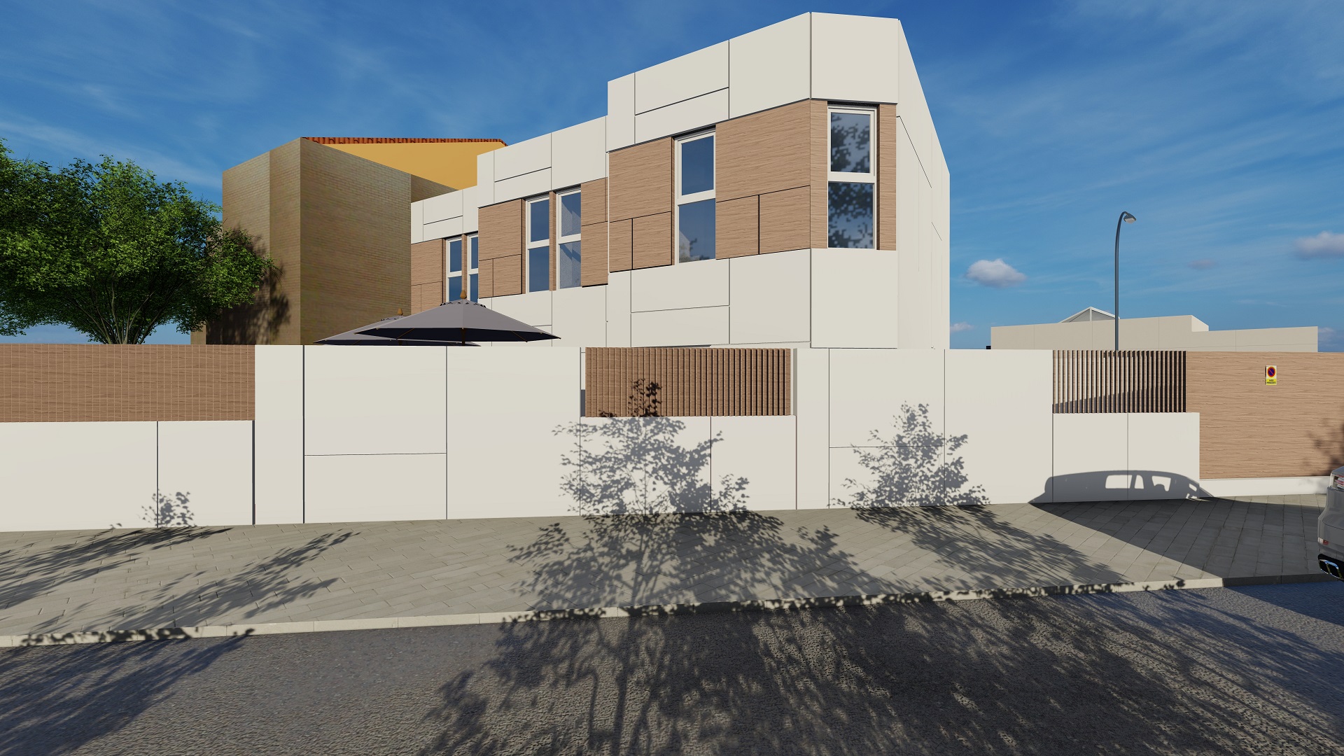 + Fachada ventilada con estructura de perfilaría metálica y placas compactas laminadas a alta presión de HPL y/o placa de fibrocemento con las mismas características mecánicas e ignífugas, en distintos tonos sobre soporte-cerramiento de panel de doble chapa de acero y núcleo de poliestireno ignífugo de 3,5-6 cm., amarrado a la estructura.