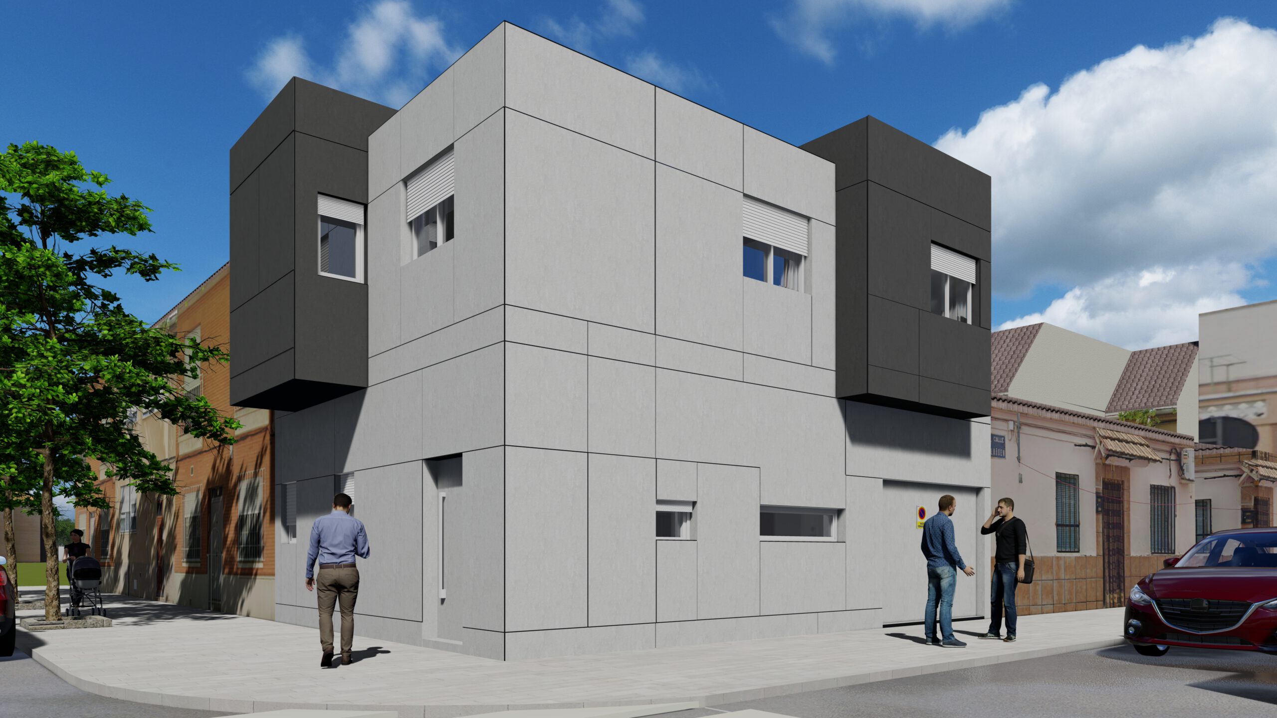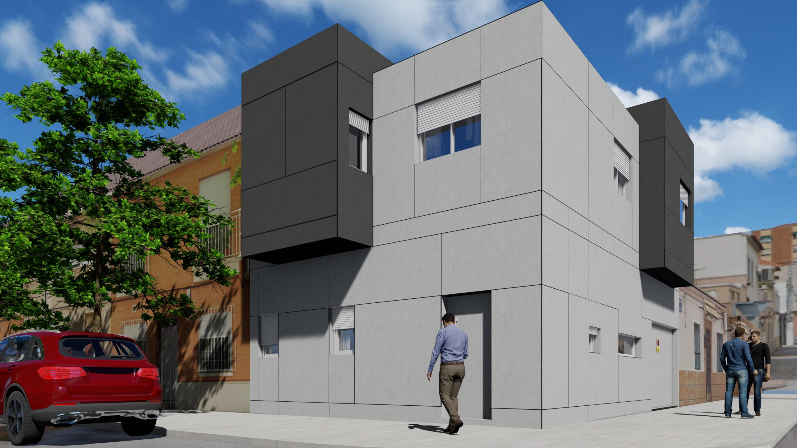 * Fachada ventilada con estructura de perfilaría metálica y placas compactas laminadas de fibrocemento ignifugas, en tono claro, sobre soporte-cerramiento de placa de doble chapa de acero y núcleo de poliestireno ignifugo de 3,5 cm., amarrado a la estructura.